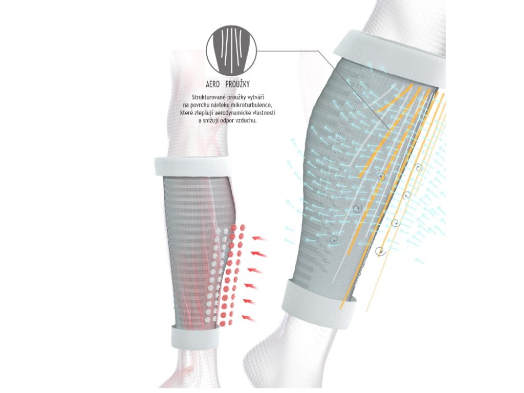 Inovativní strukturovaná tkanina v přední části návleku (kombinace AERO.DOTS a AERO PROUŽKŮ) uměle vytváří mikroturbulence na přední straně nohy tak, aby nebyly cítit na zadní straně (což by cyklisty spíše zpomalovalo).