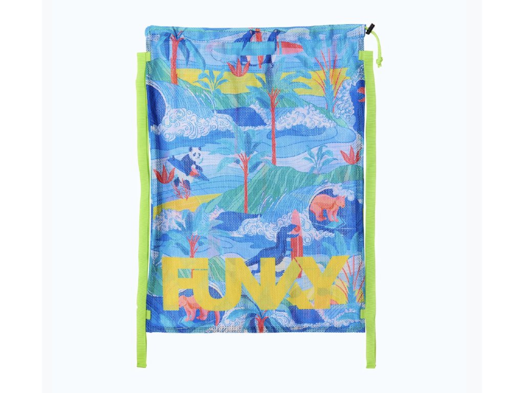 Funky Trunks Mesh Gear Bag - Duuude je dokonalá síťovaná taška na přenášení a ukládání všech vašich plaveckých a tréninkových pomůcek. Taška je vyrobena ze silné nylonové síťoviny, s otvorem pro stahovací šňůrku pro snadný přístup a ramenními popruhy pro pohodlné přenášení.
