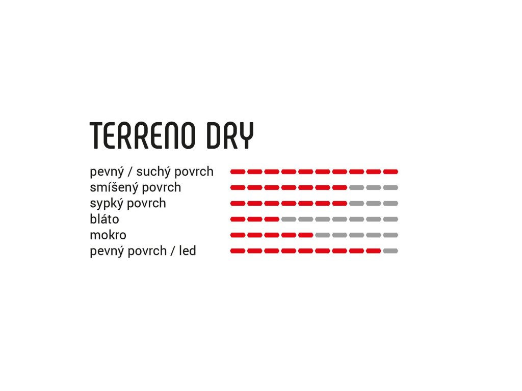 TERRENO DRY Jak už název napovídá, tento plášť je určen zejména pro sušší XC tratě. Unikátní středová část vzorku je inspirovaná kaprem - konkrétně jeho šupinami. Díky tomu klade během jízdy nízký valivý odpor, ale při změnách směru, akceleraci, nebo brzdění, se šupiny zakousnou do podkladu a nabídnou tak více než slušnou oporu a jistotu, kterou podpoří i výraznější zvýšený vzorek na bocích. Díky grafenové směsi nabízí velmi slušnou odolnost a přilnavost. Bezdušová verze Kevlarová patka Konstrukce kordu NYLON 120 TPI Inovovaná směs Grafen 2.0 pro ještě lepší vlastosti - nižší valivý odpor, vyšší přilnavost (zejména za mokra) a delší kilometrový nájezdDoplňkové parametry
