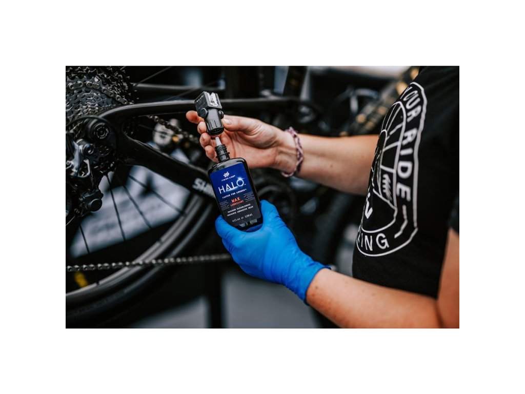 HALO Wax-Film je prémiové mazivo Finish Line na bázi vosku s bezkonkurenčním výkonem v podobě skvělé čistoty řetězu a velkého kilometrového nájezdu mezi jednotlivými aplikacemi maziva. Mazivo je tvořeno malými částicemi wolframu, vysoce rafinovaným parafínem a keramickou nepřilnavou technologií. Díky tomu je řetěz velmi tichý, dokáže zacelit malá poškození převodů a má malý odpor tření. Vstupte do nové dimenze údržby řetězu!BALENÍ kapátko 120 ml