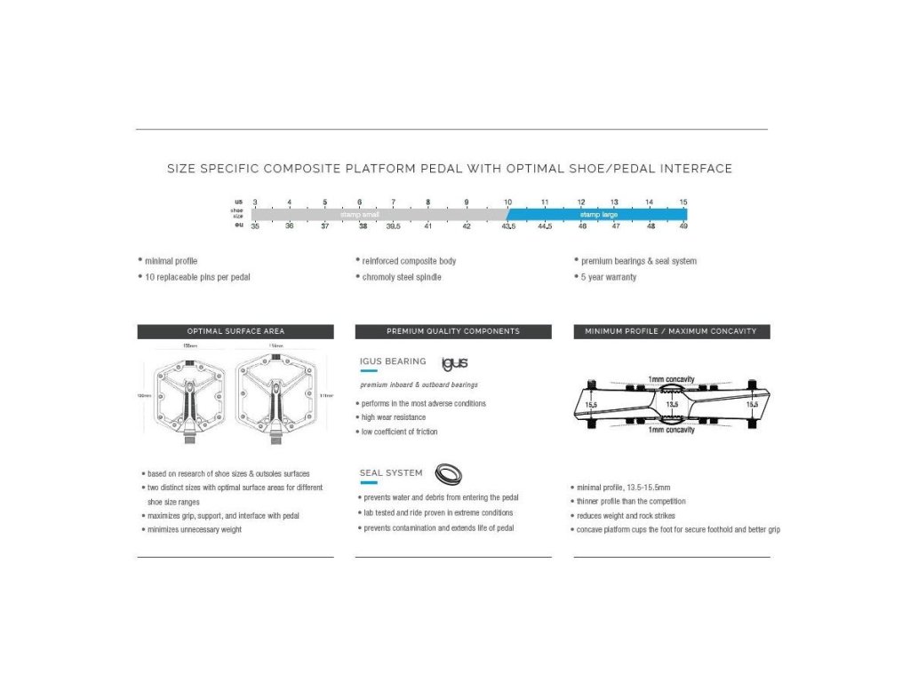 Je tu nová generace nejoblíbenějšího platformového pedálu z Kalifornie! Nové pedály Stamp 1 staví na odkazu celé rodiny pedálů Stamp a představují konkávní platformu pro větší jistotu na trailu, prověřené vnitrřní komponenty z pedálu Stamp 7 pro skvělou odolnost a životnost a nový jednodílný design pinů pro co největší grip a jejich snadnou výměnu! Nová verze pedálů Stamp 1 byla vytvořena s nekompromisním závazkem ke kvalitě a může se pochlubit robustním nylonovým tělem a osvědčenými vnitřnostmi z oceňovaných pedálů Stamp 7. Nové Stamp 1 vám zkrátka budou skvělou oporou každou jízdu. Použití: trail/enduro/freeride/DH/elektrokola/sport/commuting Tenký, konkávní profil - výška těla pedálu 13,5 mm až 15,5 mm Hmotnost 348g Tělo platformy: 114 x111 mm (boty 43,5 až 49), výška 13,5-15,5mm Platforma: nylon kompozitová Osa: kovaná Cr-Mo ocel Vnitřní ložisko: Igus LL kluzné pouzdro Vnější ložisko: Igus LL kluzné pouzdro Nové jednodílné vyměnitelné piny, 10 kusů na pedál (výška vnitřních pinů 23mm, výška vnějších pinů 25mm) Stamp Small doporučeno pro velikosti bot: 3-10 (US M) // 37-43,5 (EU) Stamp Large doporučeno pro velikosti bot: 10-15 (US M) // 43,5-49 (EU)Doplňkové parametry