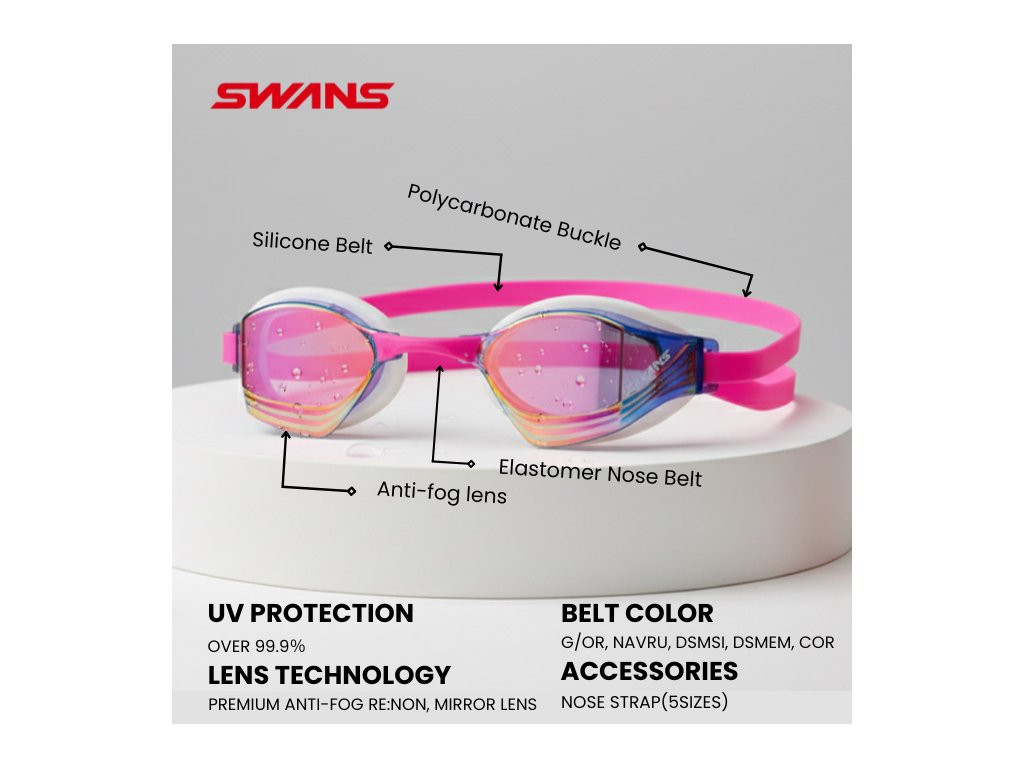 Curved Lens (Zakřivená skla): Hydrodynamický tvar čoček Swans není jen estetickou záležitostí. Rozšiřuje periferní vidění, což je klíčové pro orientaci v triatlonovém balíku nebo sledování soupeřů v sousedních drahách bez otáčení hlavy.