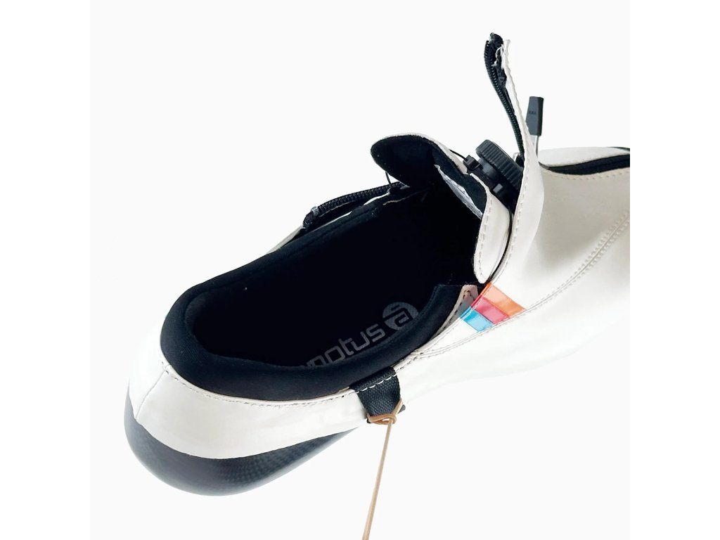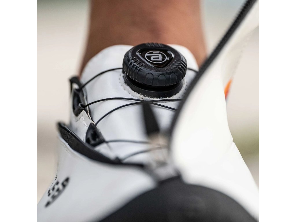 Aerodynamika hraje klíčovou roli, zejména když není možné jet v závětří. Tyto boty jsou vybaveny jedinečným systémem zapínání s otočným uzávěrem, chráněným hladkým krytem tkaniček, který se otevírá na zip. Tento design minimalizuje texturu a prohlubně, což vede k významnému snížení odporu vzduchu. Testy v aerodynamickém tunelu potvrzují zisk až 10 wattů, což vám umožní snadno překonat aerodynamický odpor.